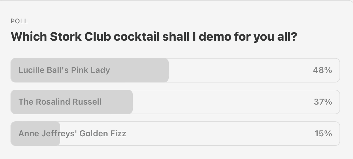 I little while ago, I asked y’all which cocktail I should demo from the newly acquired Stork Club Cook and Bar Book.